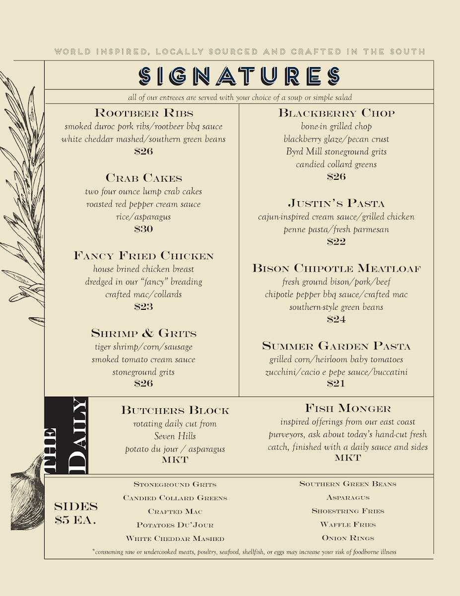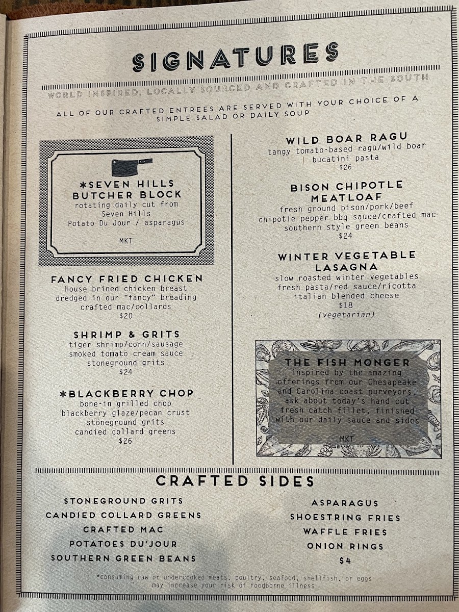 Alongside the main dishes, Crafted offers a variety of sides from crispy shoestring fries to creamy stoneground grits, allowing guests to customize their meals to taste and appetite. The food complements the restaurant’s relaxed vibe, providing options that are both familiar and a bit unexpected, appealing to those who appreciate quality and thoughtful preparation without fuss.