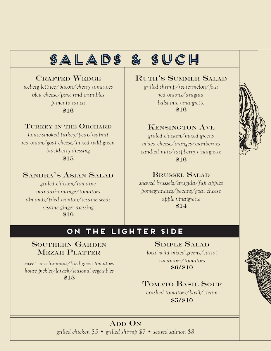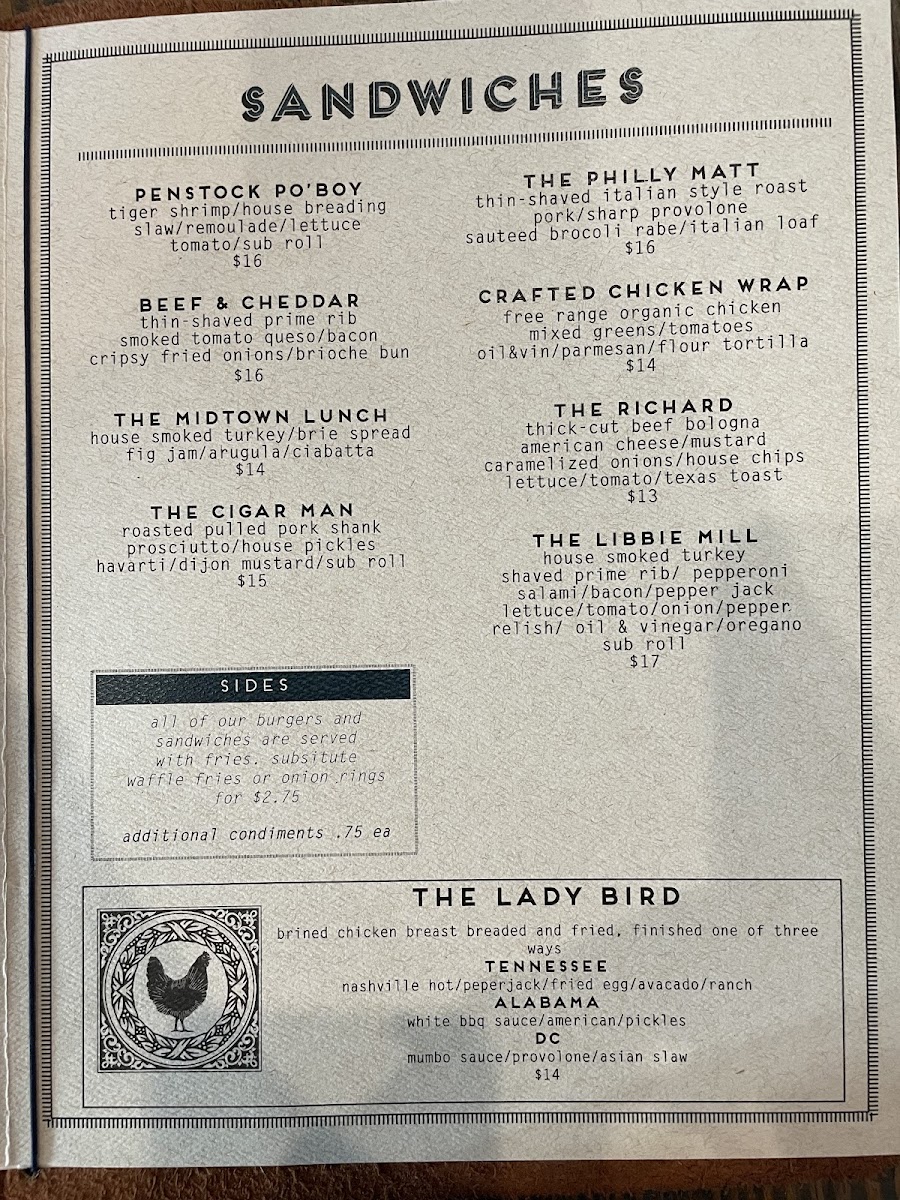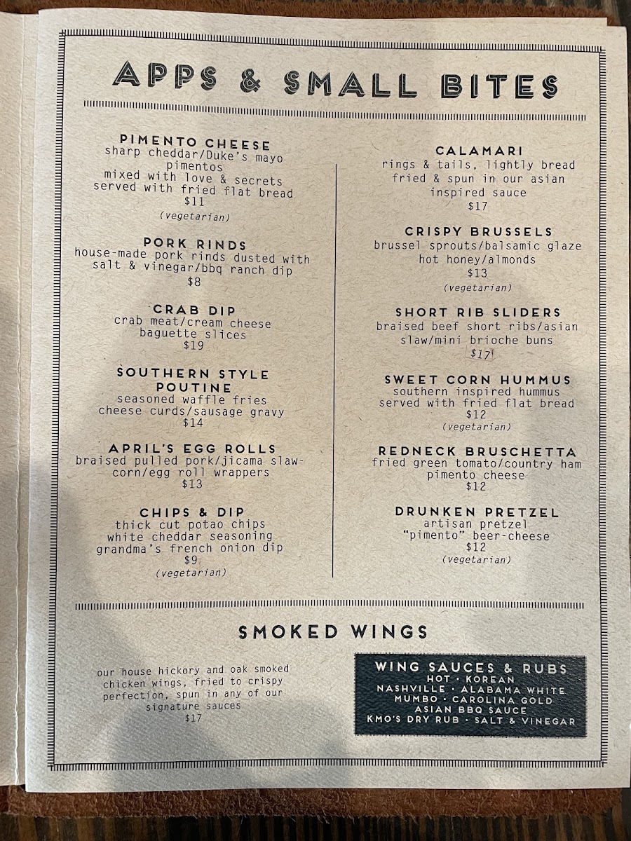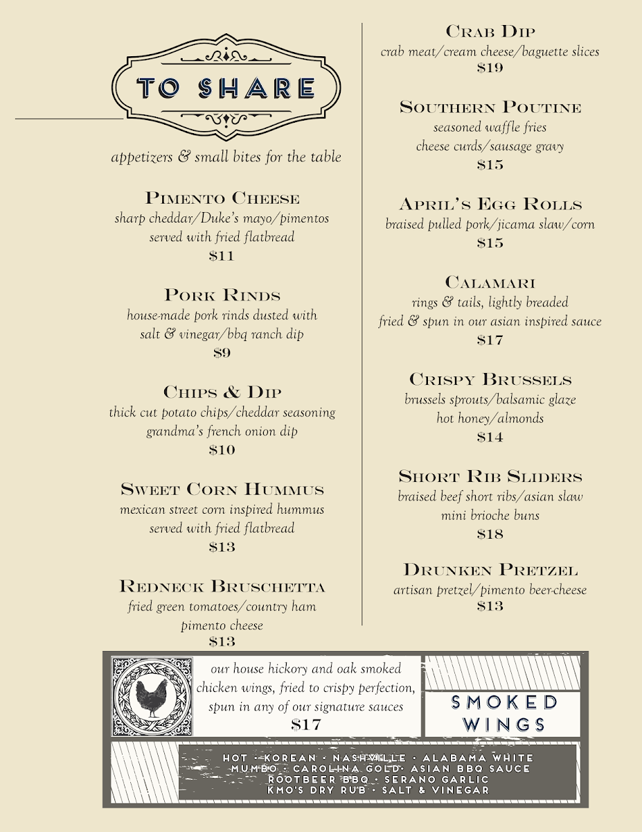 The menu also features shareable plates and elevated bar snacks, including Fried Oysters, Crab Dip, and Pulled Pork Egg Rolls. These dishes pair well with the carefully curated drink selection, which includes local beers, inventive cocktails like the Cold Brew Old Fashioned, and refreshing choices such as Strawberry Cider. Whether you’re settling in for a casual lunch or enjoying happy hour on the patio, the menu supports a welcoming, unpretentious atmosphere.
